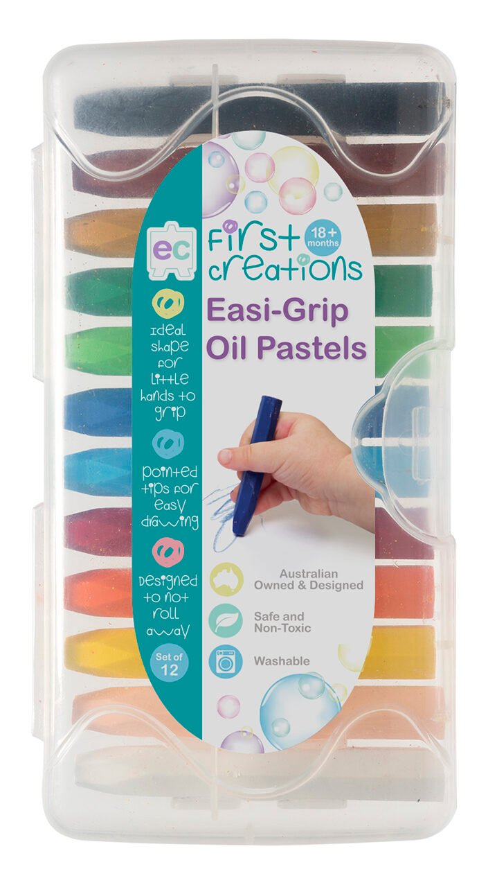 These safe and non-toxic Easi-Grip Oil Pastels have rich colour and creamy laydown. Oil Pastels are soft therefore perfect for children to blend together and experiment in colour recognition…if you mix red and yellow what colour does it make?The hexagonal design makes them easy to grip and also ensures they won’t roll away! Pointed tips allow for detailed drawing and won’t break easily. Pastels are individually wrapped in a matching colour paper sleeve for easy identification when out of the packet and/or worn down. All packaged in a sturdy carry case for easy storage and travel.
